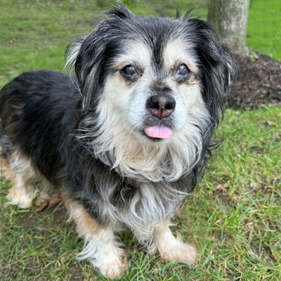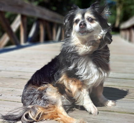 Princess is positively precious! Our sweet girl is 11 years old and 28 pounds. Her breed, you wonder? We're not sure, but we see some spaniel with maybe corgi, pekinese and mini Aussie in the mix, too! One thing we do know -- she is a beauty! She is good with dogs, cats and kids.