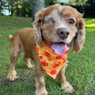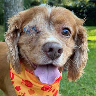 Charlie is the goodest boy!  Charlie is around 8 years old, 31 pounds and uber friendly.  Charlie has the prettiest long tail that never stops wagging (click here)! He is friendly with his foster sister, and we know he lived with cats before.  When Charlie arrived, his eye pressures were extremely high and painful, and he was not visual in the eye, so we removed it.  Charlie woke up and INSTANTLY felt better and his great personality returned.  We're so happy we could help Charlie feel better and now to find the perfect forever home.  Charlie kept his crate clean at the shelter and vet's office.  He is a fan favorite with all his charm.